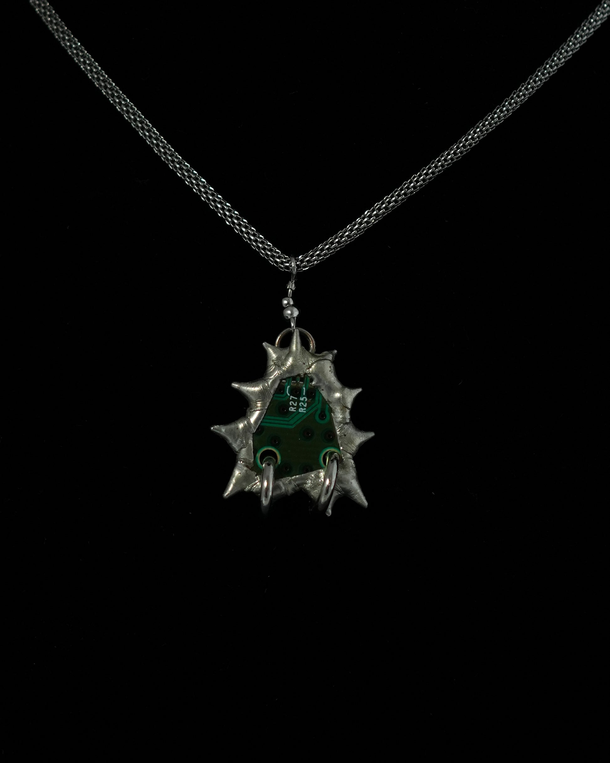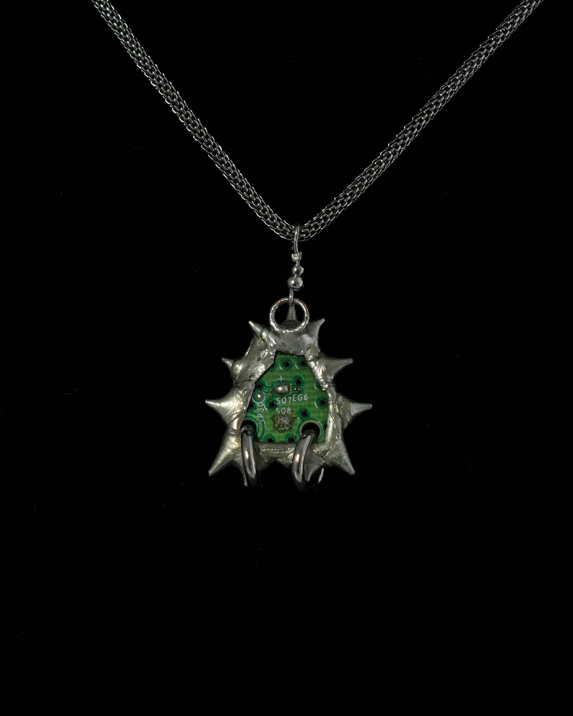 This one-of-a-kind pendant is handcrafted using salvaged electronic circuitry from a broken Xbox controller and camera, created using the Tiffany stained glass technique.