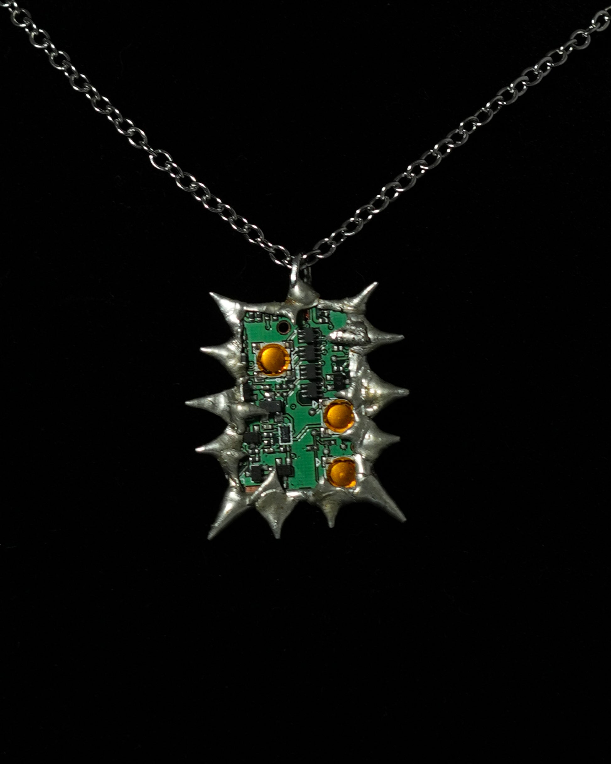 This one-of-a-kind pendant is handcrafted using salvaged electronic circuitry from a broken Xbox controller and camera, created using the Tiffany stained glass technique.