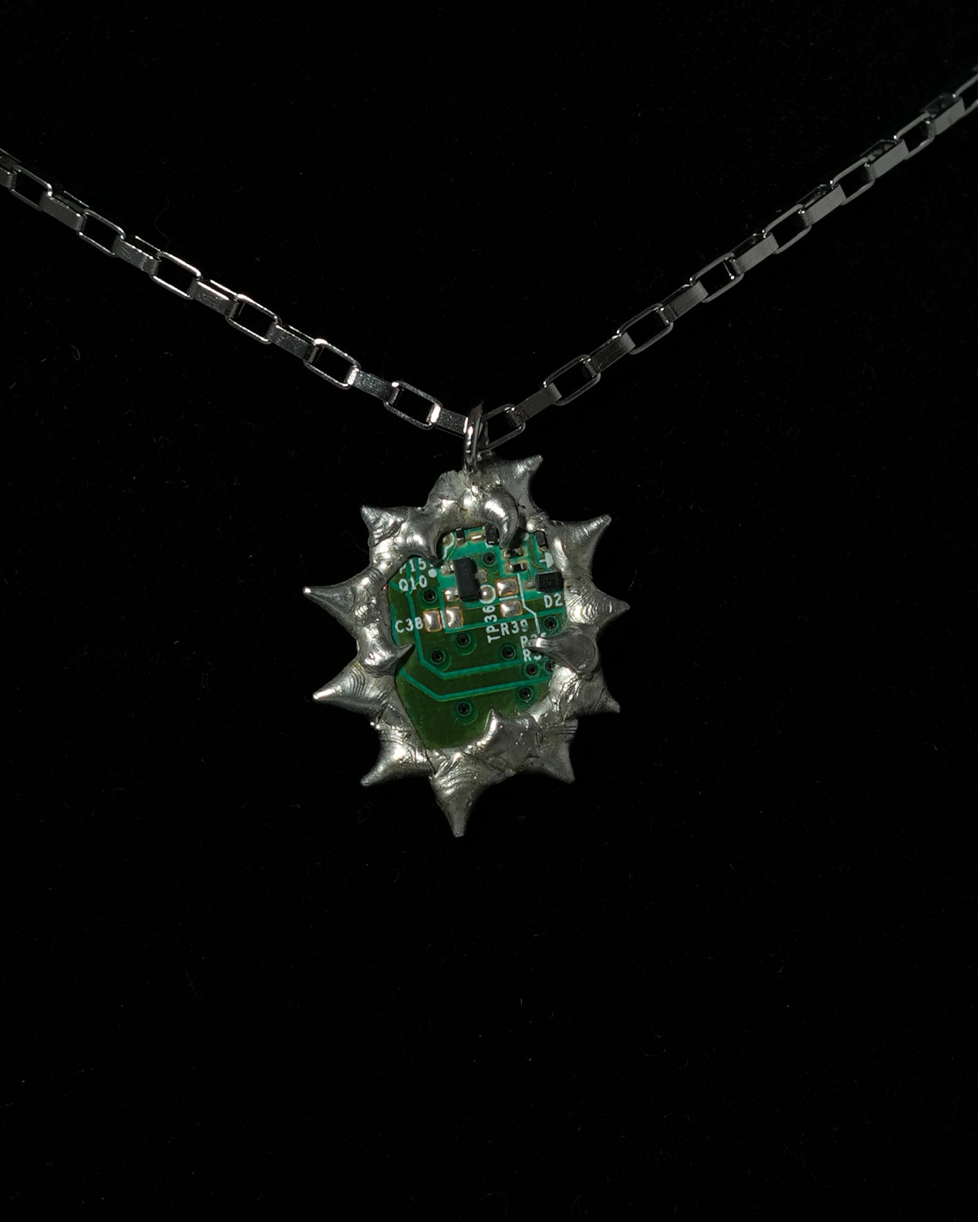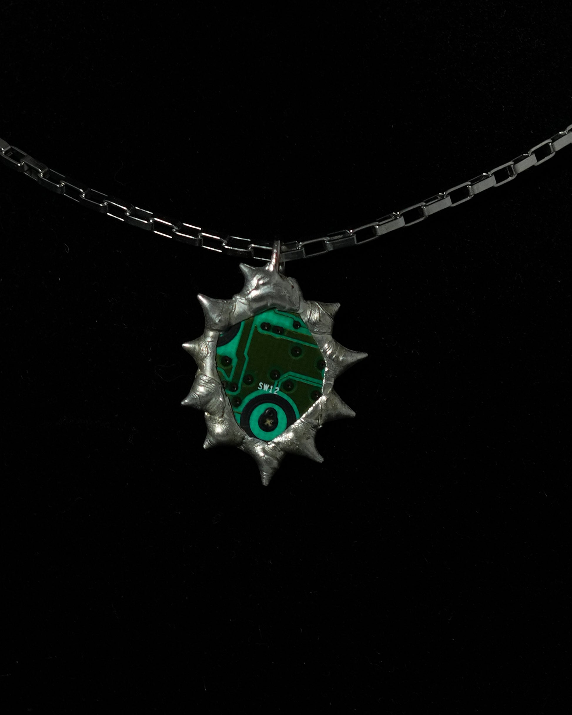 This one-of-a-kind pendant is handcrafted using salvaged electronic circuitry from a broken Xbox controller and camera, created using the Tiffany stained glass technique.