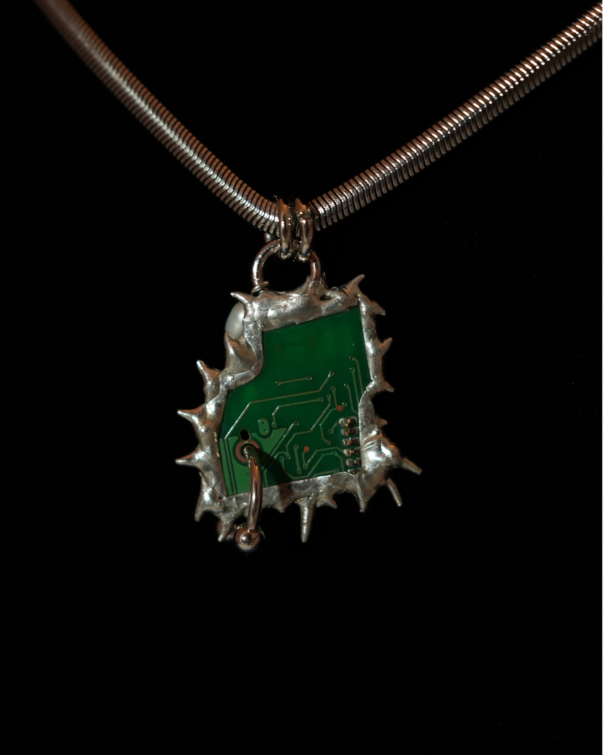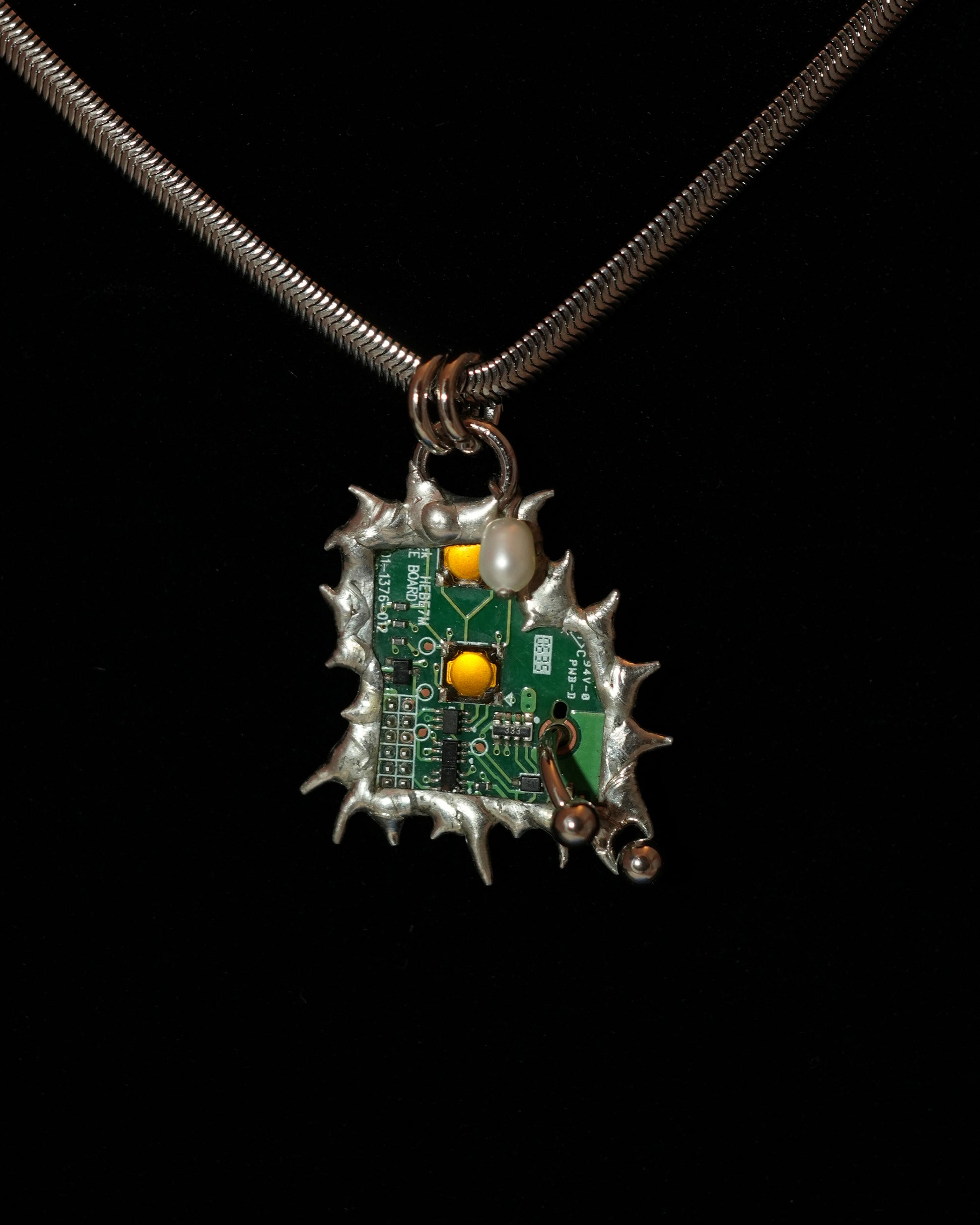 This one-of-a-kind pendant is handcrafted using salvaged electronic circuitry from a broken Xbox controller and camera, created using the Tiffany stained glass technique.